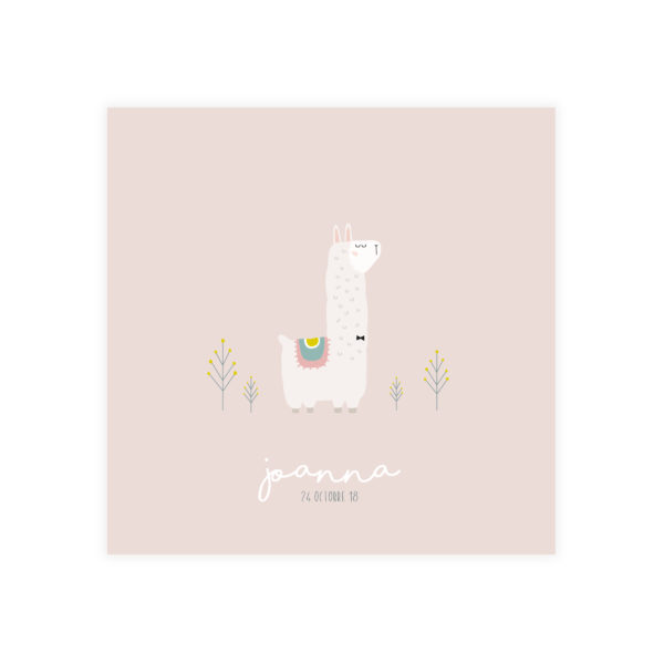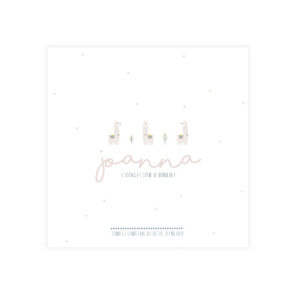 Imprimé en couleur recto et verso, le faire-part « Lama » est disponible en format 10×15 cm ou en format 12×12 cm, sur différents papiers (lisse, structuré ou recyclé).