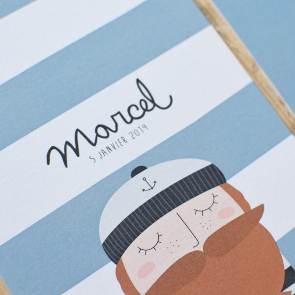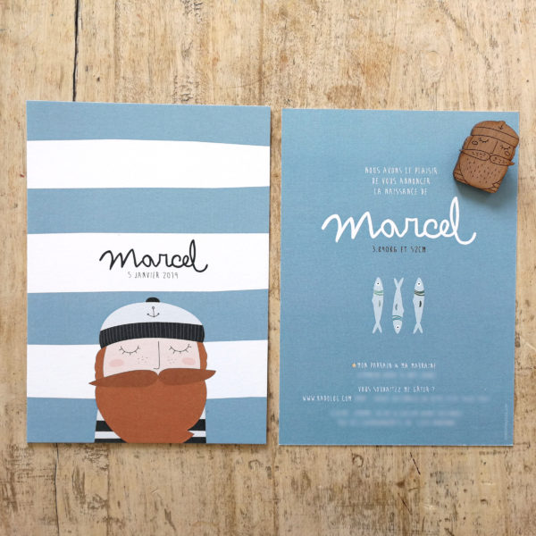 Imprimé en couleur recto et verso, le faire-part « Marin » est disponible en format 10×15 cm ou en format 12×12 cm, sur différents papiers (lisse, structuré ou recyclé).