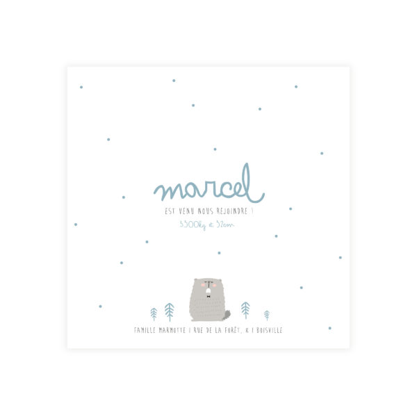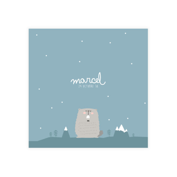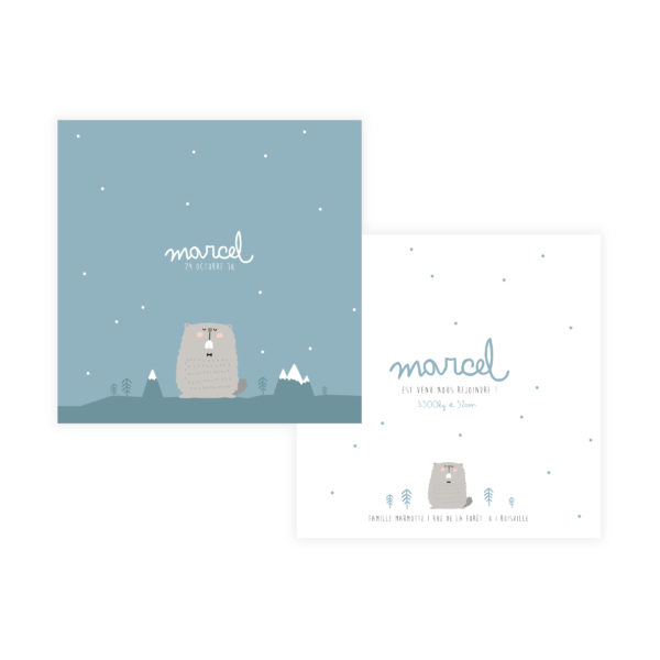 Imprimé en couleur recto et verso, le faire-part « Marmotte » est disponible en format 10×15 cm ou en format 12×12 cm, sur différents papiers (lisse, structuré ou recyclé).